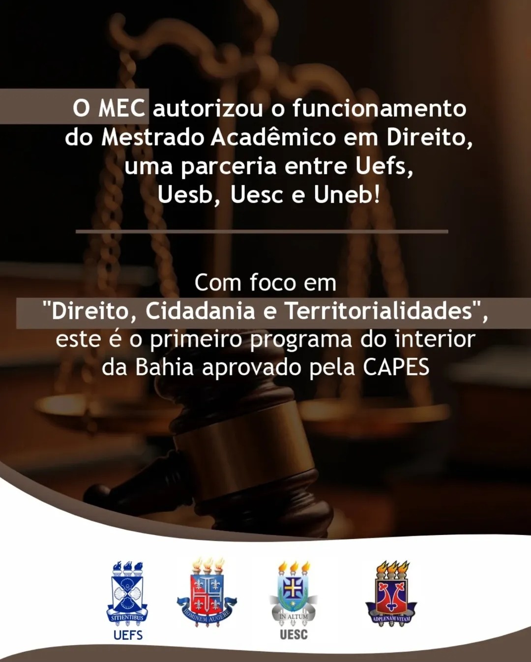 O MEC autorizou o funcionamento do Mestrado Acadêmico em Direito, uma parceria entre UEFS, UESB, UESC e UNEB